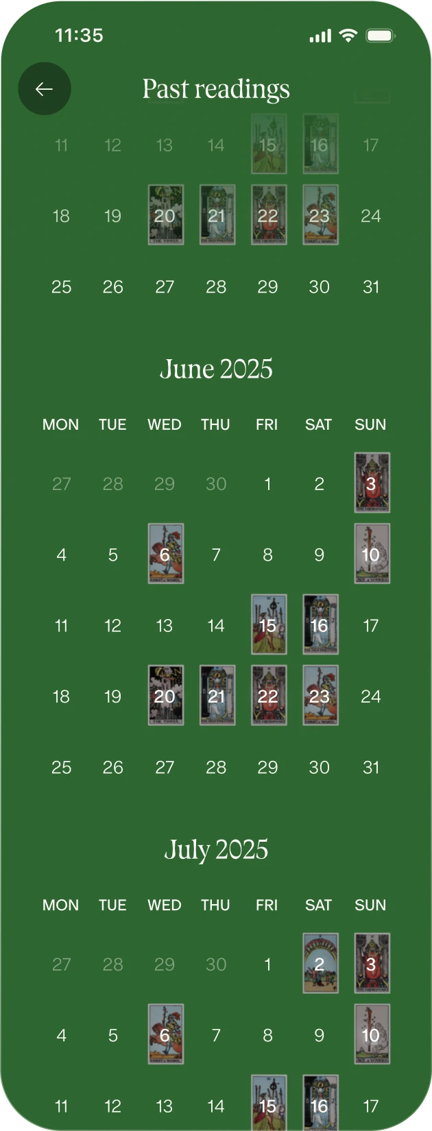 See every card you’ve pulled over time and notice the patterns shaping your story